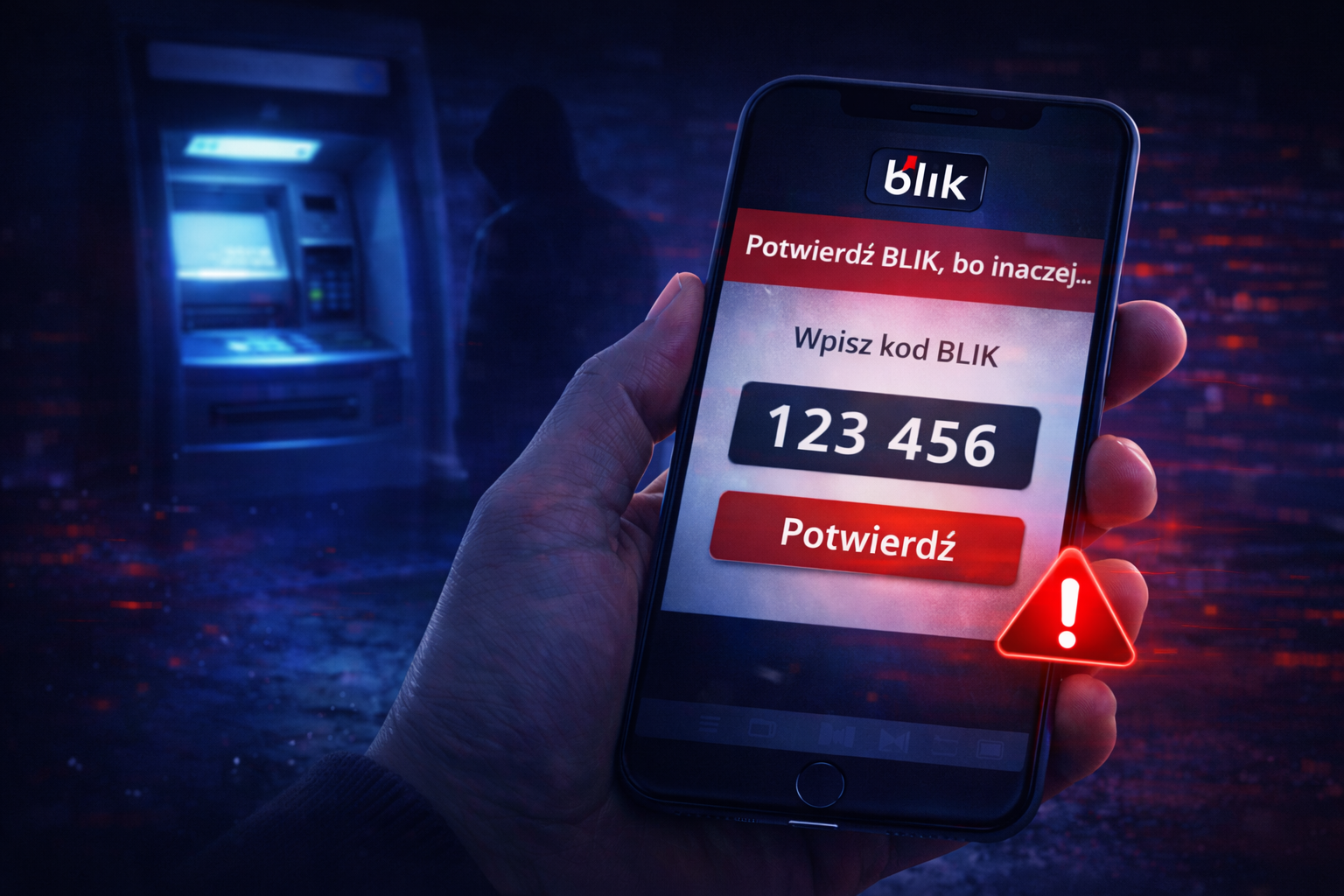 Oszust podszywa się pod sprzedawcę/kuriera i prosi o kod BLIK. Kod + zatwierdzenie w aplikacji = wypłata w bankomacie.