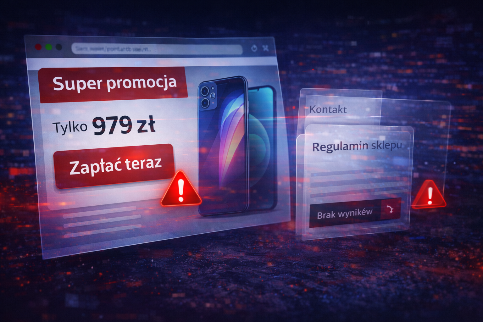Strona wygląda jak normalny sklep: ładne grafiki, koszyk, „promocja -70%”. Często jednak brakuje realnych danych firmy, regulaminu, a płatność prowadzi przez podejrzaną bramkę. Po zapłacie: cisza, brak kontaktu albo „tracking”, który nie działa. Czasem dodatkowo wyłudzane są dane karty.