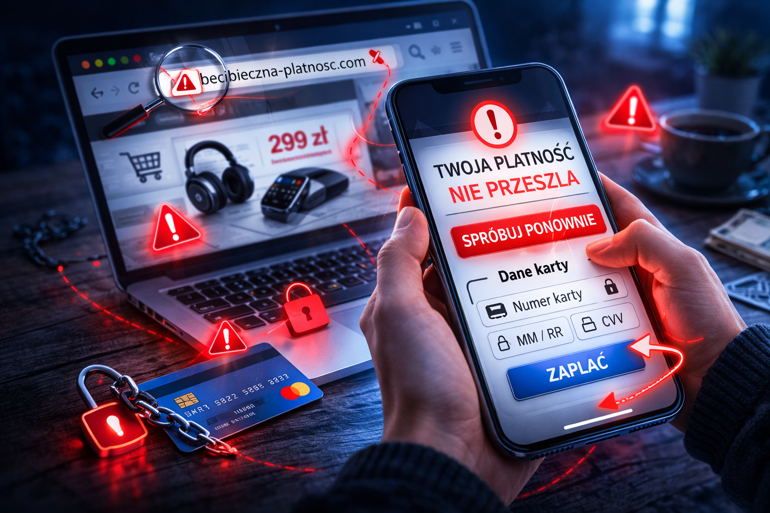 Widzisz komunikat o błędzie płatności, a po chwili dostajesz link do „ponownej płatności” albo przekierowanie na inną bramkę. Czasem to reklama/popup, czasem podstawiona strona. Cel: żebyś wpisał dane karty drugi raz – już na fałszywej stronie.